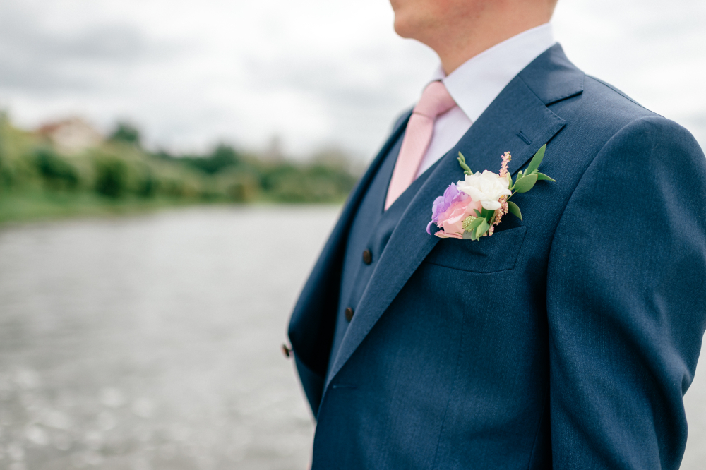 Les accessoires exaltent sa personnalité : chaussures bicolores, ceinture cuir noir patiné, pochette soie irisée, boutons de manchette modernes. Cette teinte se marie parfaitement avec les bouquets aux accents métalliques, les décors aux tons pierre ou bois, et les robes aux détails perlés, typiques des mariages albigeois raffinés.