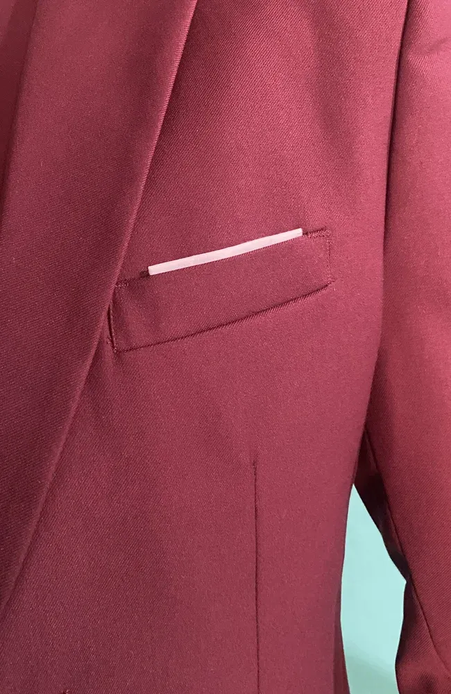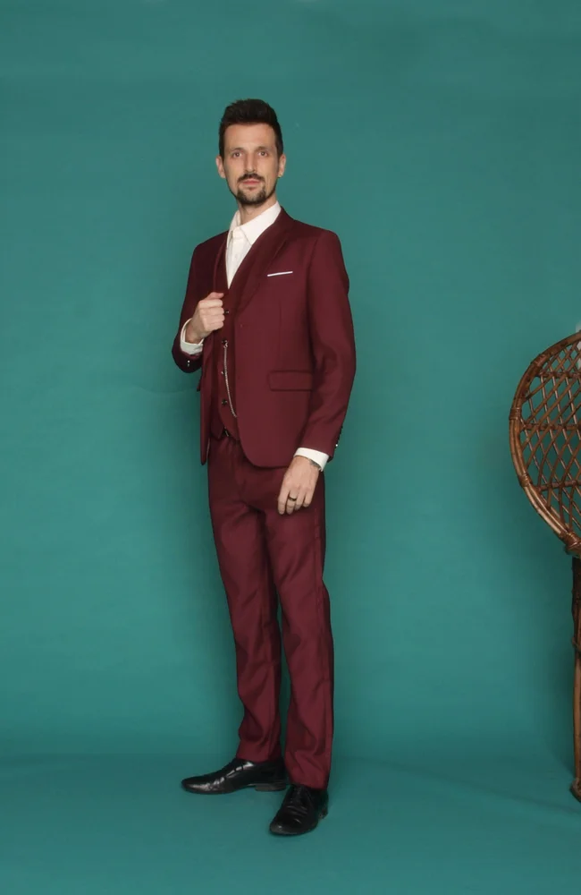 Chez Robe de Cœur, votre boutique de tenues de mariage à Albi, nous sommes ravis de vous présenter notre nouvelle collection de costumes de mariée pour homme. Aujourd'hui, nous mettons à l'honneur un costume trois pièces d'une élégance rare, de couleur bordeaux, parfait pour le marié qui souhaite se démarquer avec style.