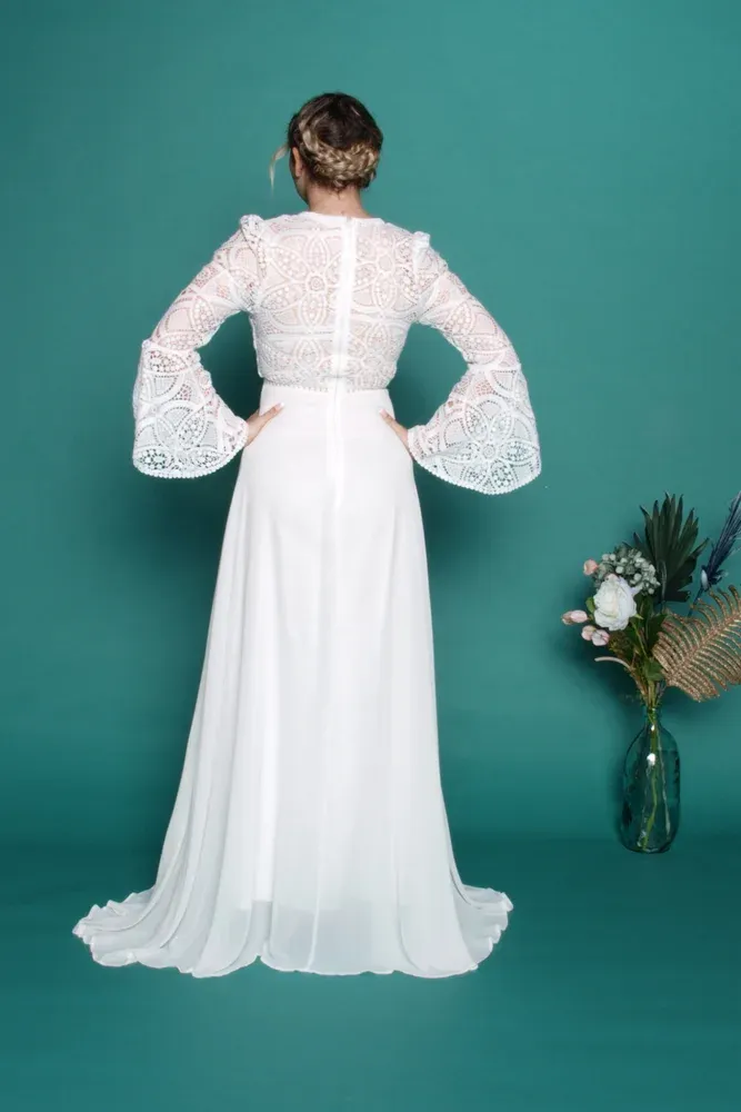 - Des robes bohèmes en dentelle ajourée, idéales pour un mariage champêtre,