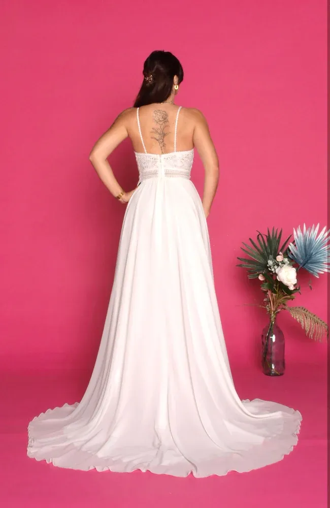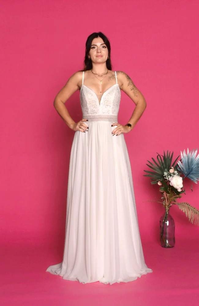 Chaque robe peut être adaptée à votre silhouette grâce à nos retouches personnalisées. Nous ajustons minutieusement chaque modèle afin que votre robe de mariée bohème vous corresponde pleinement : travail du buste, longueur de la jupe, ajustement des manches, ajustements du décolleté… Rien n’est laissé au hasard. Notre savoir-faire acquis depuis plus de dix ans nous permet de sublimer chaque tenue pour qu’elle devienne unique, exactement à votre image.